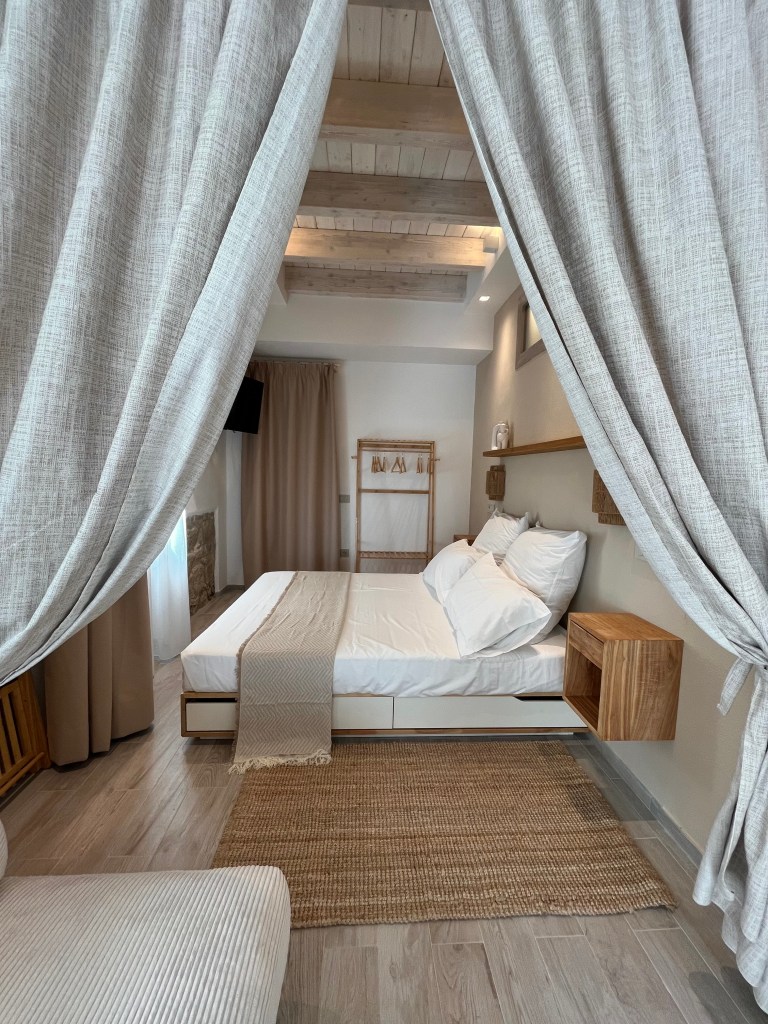 The intimate sleeping area, hidden behind a refined arched curtain, is the ideal place to unwind. The bathroom, featuring natural materials and a spacious shower, provides everything needed for a rejuvenating stay. Book now and experience the beauty of the sea, combined with the comfort and charm of the Sabbia Apartment.
