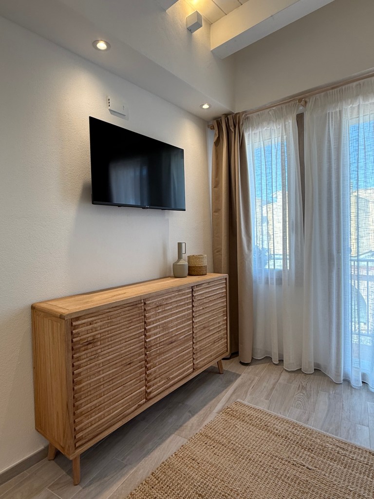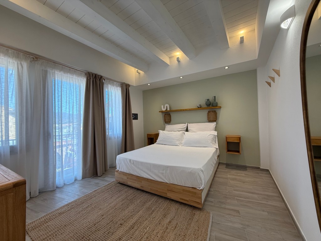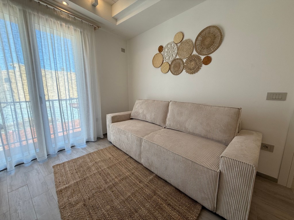 If you’re looking for a spacious and relaxing environment suitable for two people or a small family, the Acqua apartment is the ideal choice. The beach-inspired shades and the light streaming through the large windows create a calm and welcoming atmosphere. The apartment features a balcony, a fully equipped kitchen, and a cozy dining area. The relaxation zone, with a sofa perfect for leisure time after a day at the beach, can also be used as an extra bed for a guest.