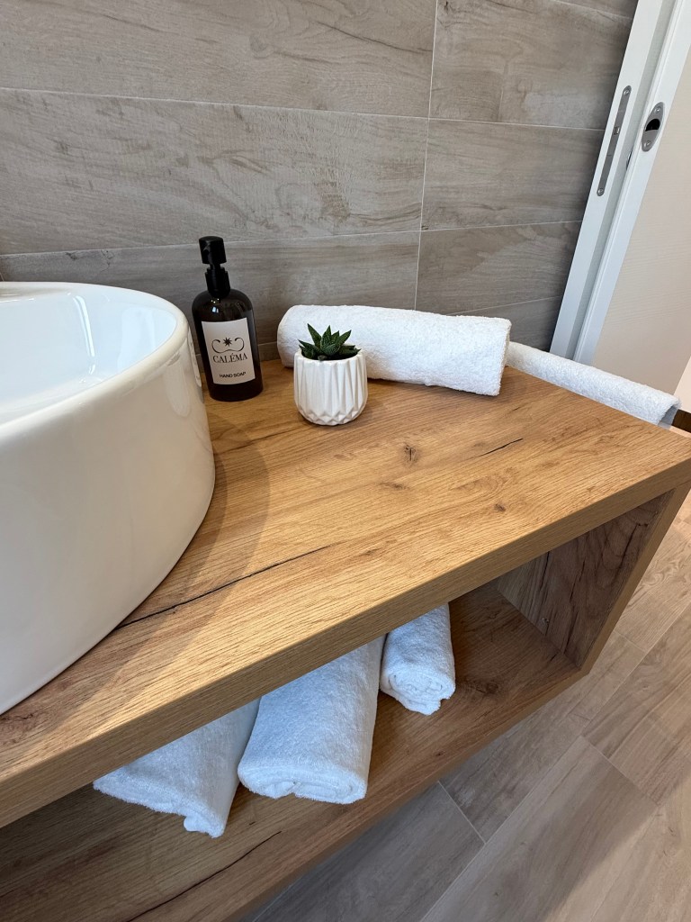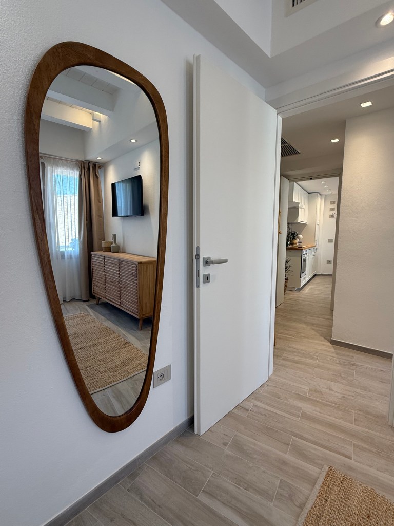 The bedroom is separated from the living area by a small corridor, ensuring more privacy. The bathroom, spacious and made with natural materials, has a large and comfortable shower. This apartment is designed to provide you with a peaceful and worry-free stay. Book now and discover the beauty of Villasimius, without missing a thing. Choose the Acqua apartment for your vacation.